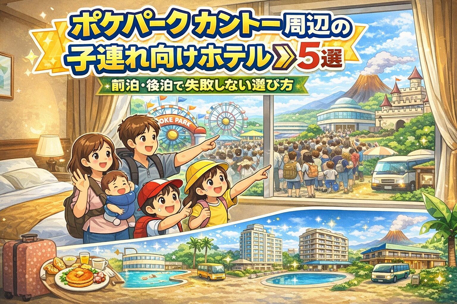 ポケパーク カントーに子連れで行くとき、「どこに泊まれば移動がラク?」「前泊した方がいい?」と悩む方は多いですよね。